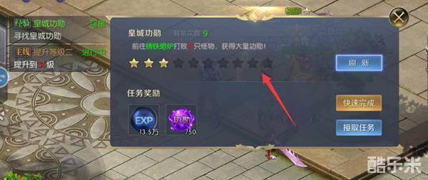 进入游戏后,就是做我们的主线任务了。还有一个就是小飞鞋系统,点击小飞鞋就能快速传送到下一个任务点,这样流程就快了不少哦。当我们主线人物要升到下一级才能开启的时候,我们就可以去做皇城功勋这个任务了,记得把星级刷满和完成时双倍领取哦,加的经验和功勋都是很可观的。