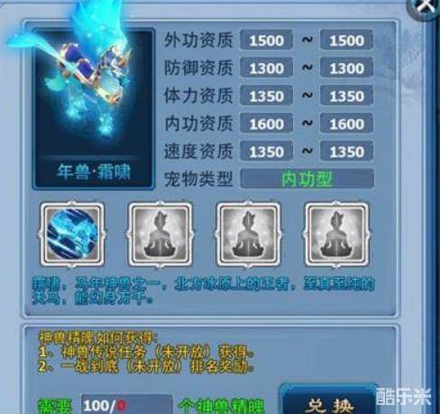 神雕侠侣手游年兽霜啸属性技能是小编为大家带来的,年兽▪霜啸,内功型,马年神兽之一,北方冰原上的王者,至真至纯的天马,能幻身万千。下面和小编一起来了解一下吧。