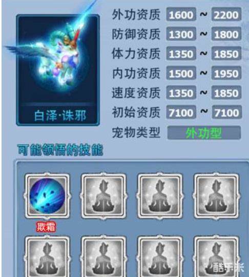 | 可能领悟技能 | 【欺霜】:对敌方单个目标造成大量外功伤害,如果目标不是玩家,则造成额外伤害(最高造成100%额外伤害)。 | ||