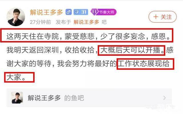 不过很多王多多忠实的粉丝还是很支持王多多的,并且也很关心王多多的近况,那么王多多最近在干什么勒?是不是会就此退出英雄联盟的解说圈勒?就在刚才,王多多就发了一条消息,阐述了自己的最近几天的一些情况。原来,王多多这两天都是在寺庙里面,蒙受慈悲。并且后天就会进行直播。并说要把最好的工作状态展现给大家,暗示将会继续主持工作。