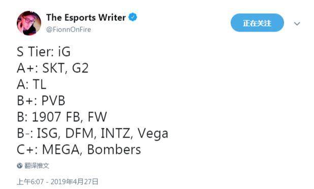从这个评级中,我们可以看出来,来自于我们LPL的IG战队就占据了独一档的S级。而随后,SKT与G2则是被评为了A+等级;接下来北美的TL战队则是A级;而来自于越南的PVB战队则是被评为了B+;另外,被评为B级的队伍拥有两支,他们分别是土耳其的著名战队1907费内巴切以及LMS赛区的闪电狼;而在B-的等级中则一共拥有四支战队,他们分别是阿根廷的ISG战队,日本LJL赛区的DFM,巴西赛区的INTZ以及独联体赛区的VEGA;最后,在C+的等级中则是东南亚赛区的MEGA战队以及大洋洲OPL赛区的Bombers战队。