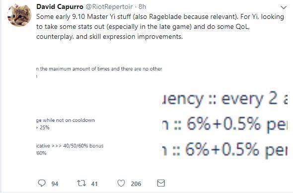 今日,Riot设计师Repertoir更新推特放出了9.10版本中无极剑圣·易以及鬼索的狂暴之刃的改动预告: