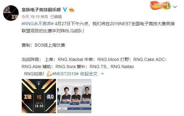 英雄联盟RNG发布赛程预告:派二队征战NEST