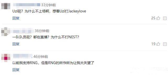 看到RNG发布的最新赛程预告,有网友评论道:Uzi呢?为什么不上场啊,想看Uzi打Jackeylove。有网友评论道:一队队员呢?都在直播?为什么不打NEST?