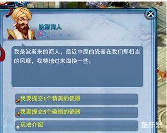 神雕侠侣OL波斯商人玩法简介是小编为大家带来的,玩家每天可以完成10次波斯商人任务,玩家需要在练功区打怪,获得破损的瓷器和精美的瓷器,交付就可以获得经验,根据角色等级,奖励的经验也不同。下面和小编一起来了解一下吧。