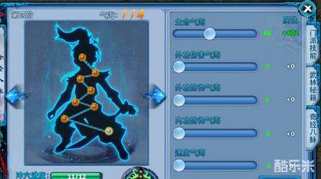 每冲开一个穴位都会获得一些气海点数,这些点数可以通过滑动右面的滑块分配到人物的各项能力之中,分配好以后,点击“确认”,分配的气海点数就转换为能力记录到人物的属性中了。
