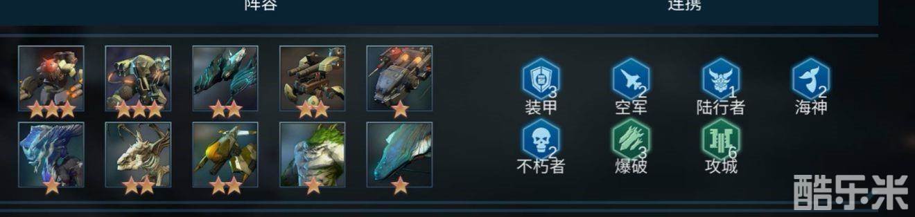 这套阵容拥有6攻城3爆破3装甲2不朽者2空军2海神1陆行者,6攻城加上3爆破使得空蟹的持续输出,方舟、幻鲸的AOE输出十分爆炸,3装甲使得整体阵容稍微肉了些,2不朽者可以让树精和古龙站起来补点输出,2空军保证空军可以有概率闪避刺客的攻击。