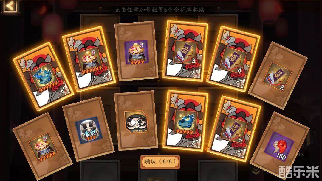 本次花牌池中超值奖励金色花牌可供大人们自由配置,初始每次奖池可配置六个金色花牌,随着抽取轮数的增加,可选金色花牌数会递增,上限九个。