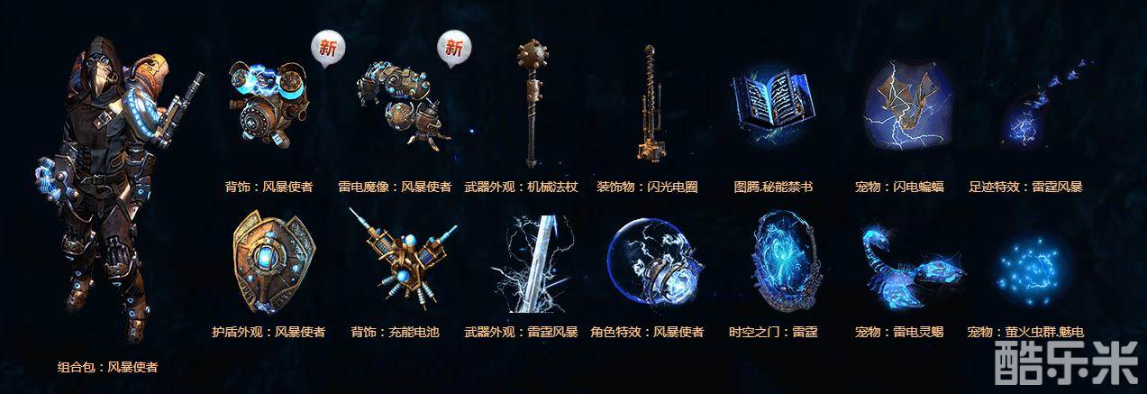 经典款百塔时装——风暴使者组合包,手部、身体及背饰的引擎装置格外抢眼,电极装置上丝丝电流闪烁细节逼真,穿着于身后浑身上下都被闪电所包裹,隔着屏幕都能感受到一丝电击感,再搭配闪电系技能的施法效果,契合度简直爆棚。