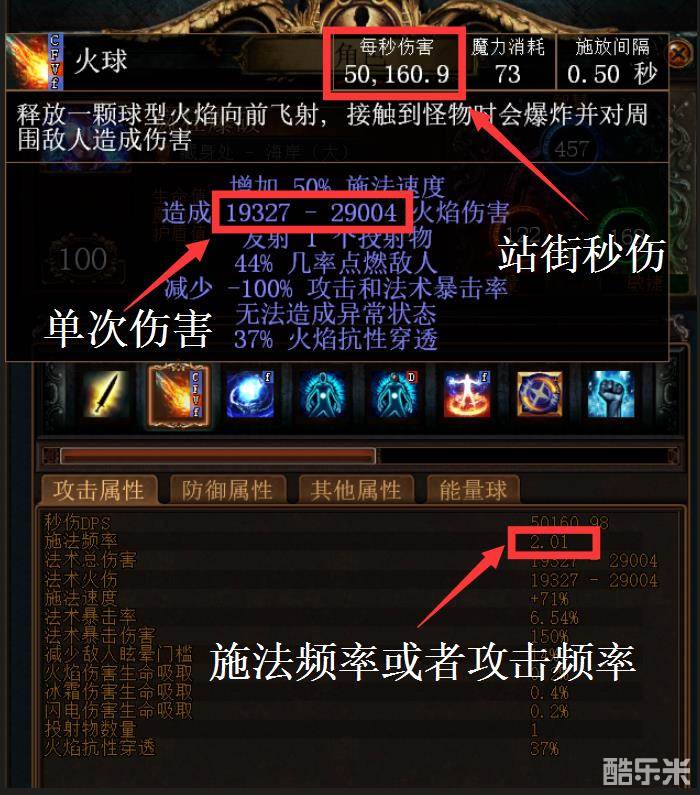 首先,要弄清楚几个名词 单次伤害 ,秒伤 , 攻击频率(注意不是攻击速度,频率是已经计算好修正速度了) ,施法频率(注意不是施法速度),暴击率,暴击伤害等。可以在下图中找到:
