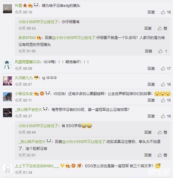 不过对于整个宣传片中没有出现第一届MSI冠军EDG夺冠的画面,还是引发了一些不满。不少网友质疑:为什么历届MSI冠军中RNG和SKT都有回顾画面,却没有EDG的,EDG拿的是MSI第一届冠军,还是击败了SKT,没想到这么没有牌面吗?只有一个浮雕,拳头也太不地道了吧!就一个镜头,三个字母完事儿了,正经夺冠画面都没有一个。