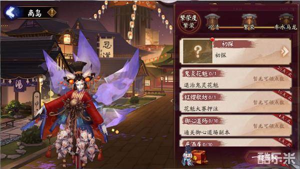 参与多种活动即可获得一定离岛名望,全服的阴阳师累计获得的名望可以提升商店街的繁荣度。繁荣度分为冷清、繁荣、车水马龙三个阶段,当繁荣度阶段提升,御心道场、居酒屋、浮世澡堂和阿浅的商店也会同时升级。