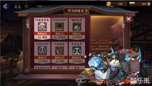 在阿浅的商店中,可以使用获得的名望兑换随机SP/SSR式神、神秘的符咒、御行达摩、SP皮肤券、六星太鼓结界卡等道具。