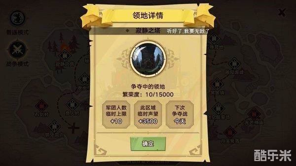在战争模式中玩家就需要在会长的带领下完成领地争夺战,每一个领地都有开启争夺的时间,同时也标明了争夺时军团的人数临时上限以及临时声望,通过增加领地的繁荣度来确定其归属,领地越多便能够获得更高的荣誉称号,称号越高的领主能够获得相应的套装以及专属坐骑哦~