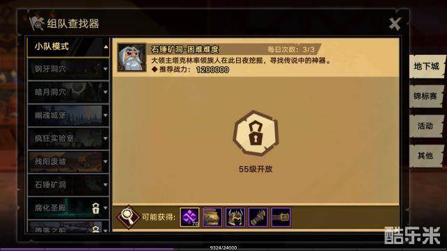 小队模式是地下城模式中最简单的一个,但相对于主线任务的副本来说刷起来也是很困难的。小队模式中有八个副本,其中困难难度最高的是石锤矿洞,腐化圣殿和堕落之船的副本分别在55级和60级时才会开放。除了钢牙洞穴之外,每个副本都有普通难度和困难难度两个模式。但如果你单打独斗,即使是普通难度也过不了。