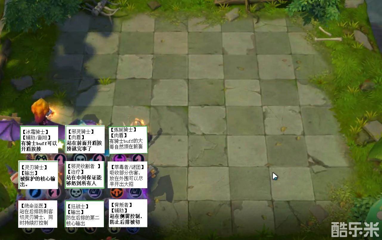 巨魔骑的站位有很多种摆法,大体上分为九宫格,满天星分散式,以及后两排平铺式三种,有时候要根据对方的阵容来变化,其中九宫格是最常见,最常规的站位,按肉盾,输出,辅助三层依次站位,又能应付刺客切后,又能对抗战士围攻,能够合理的处理大多数情况,唯一惧怕的就是被法师AOE带走,但是巧的是。