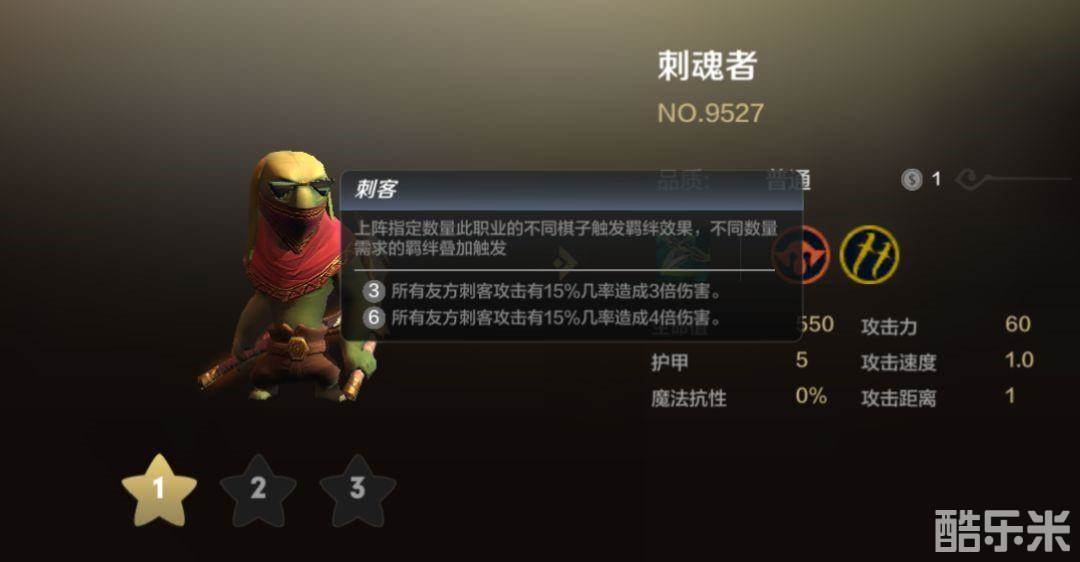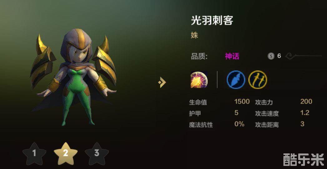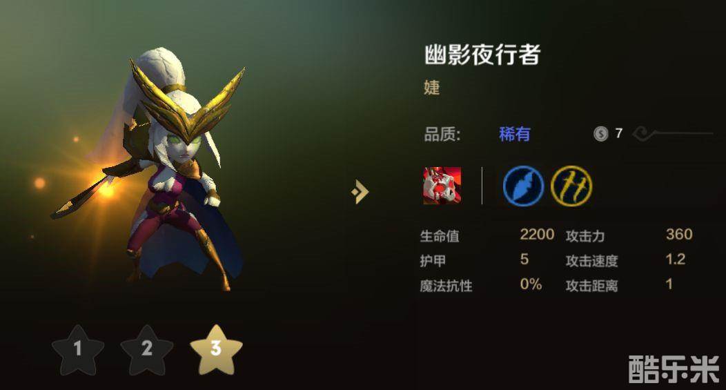 地精前中期的关键人物,1.0的攻速和1$的便宜价格,前期棋子比较好抓能够快速2⭐,大招单体伤害高、CD短充能快。刺客的属性让地精阵容有了切后排的功能。(能三星尽量三星)