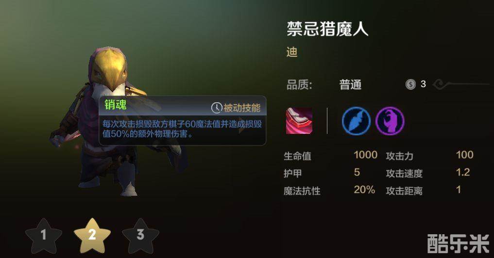 可以克制敌方的恶魔棋子,普攻削弱敌方棋子回蓝,可以对位敌方阵容的团控。1$的价格便宜比较容易三⭐,打工仔。