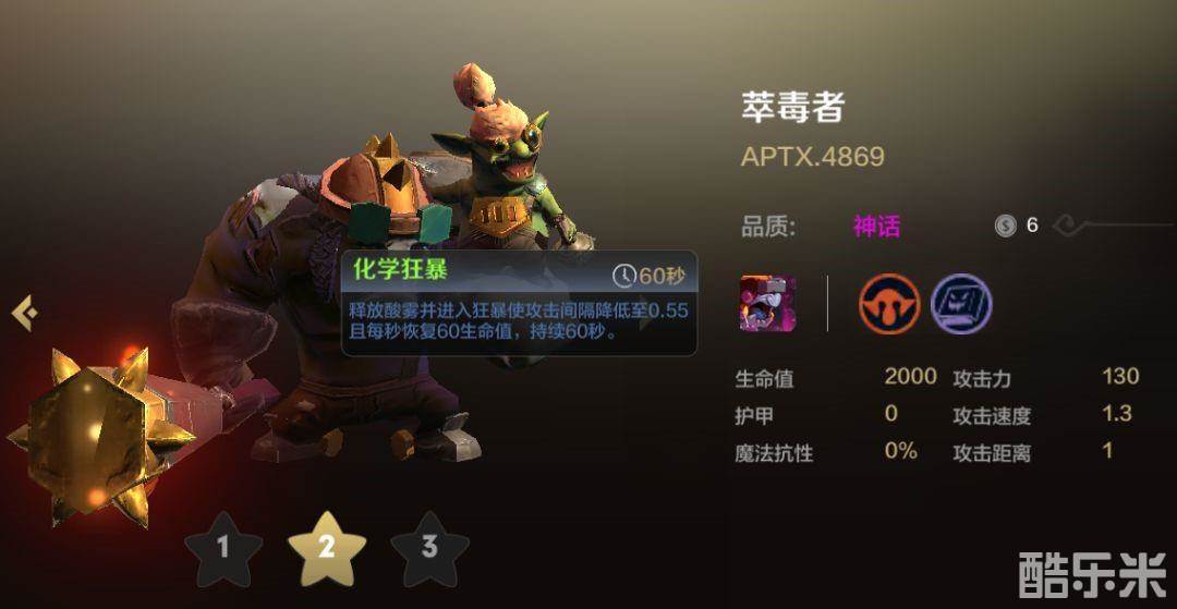 大招拥有高生命回复和酸雾范围减护甲效果,酸雾减甲效果搭配毁灭者(炸弹人)的大招可以打出高伤害。4$比较吃经济(建议二星)