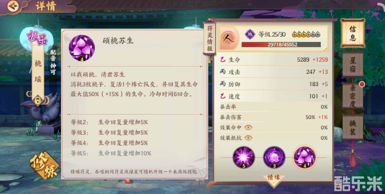 桃瑶作为一个专门的治疗型符灵,在队伍中有着不可或缺的地位。从上面的技能分析可以看出来哦,桃瑶的大招是个很关键的技能,在目前所有的符灵中,只有她拥有复活队友的能力。