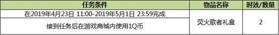 2019年4月23日 11:00-5月1日 23:59,在游戏商城内使用1Q币,即可获得2个荧火歌者礼盒!
