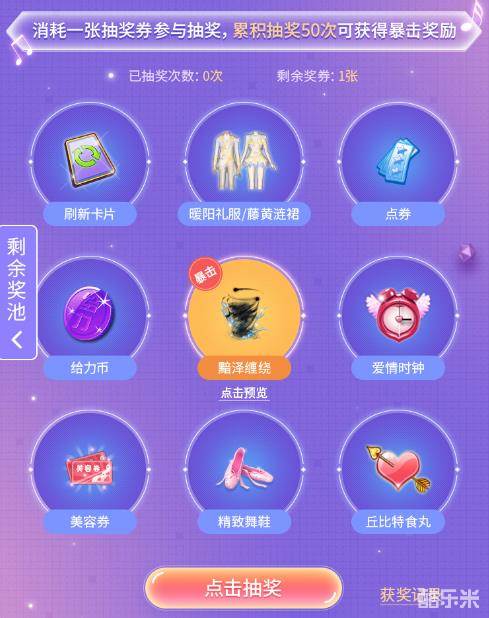 消耗一张抽奖券参与抽奖,累计抽奖50次可获得暴击奖励,快来抽取吧!