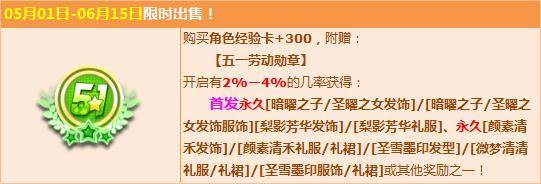 5月1日-6月15日期间,购【角色经验卡+300】,赠送【五一劳动勋章】,有机会得首发永久【暗曜之子/圣曜之女发饰】/【暗曜之子/圣曜之女服饰】/【梨影芳华发饰】/【梨影芳华礼服】、永久【颜素清禾发饰】/【颜素清禾礼服/礼裙】/【圣雪墨印发型】/【圣雪墨印服饰/礼裙】或其他奖励之一!其中核心奖励期限型概率为4%-6%,核心奖励永久型概率为2%-4%,非核心奖励概率为90%-94%。