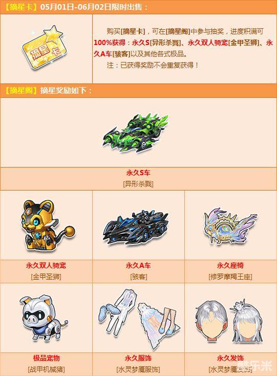 5月1日-6月2日期间,【摘星卡】闪亮上架,100%得永久S车【异形杀戮】、永久双人骑宠【金甲圣狮】、永久A车【骇客】、永久座椅【修罗摩羯王座】等豪华奖励,千万不要错过!