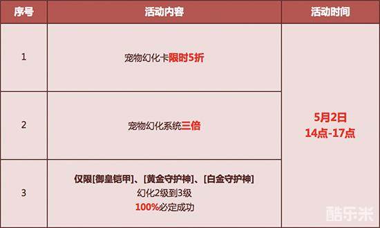 5月2日下午14点17点,宠物幻化卡限时5折、宠物幻化系统三倍成功概率!且【御皇铠甲】、【黄金守护神】、【白金守护神】从幻化从2级到3级100%成功!
