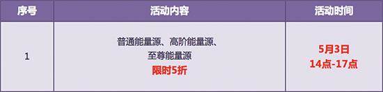 5月3日下午14点17点,普通能量源、高阶能量源、至尊能量源限时5折!