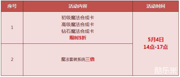 5月4日下午14点17点,初级魔法合成卡、高级魔法合成卡、钻石魔法合成卡限时5折、魔法套装系统三倍成功概率!