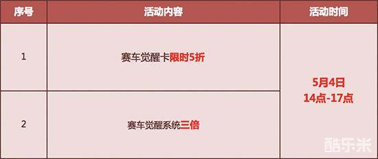 5月4日下午14点17点,赛车觉醒卡限时5折、赛车觉醒系统限时3倍概率!