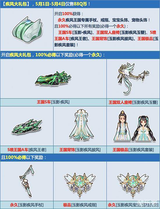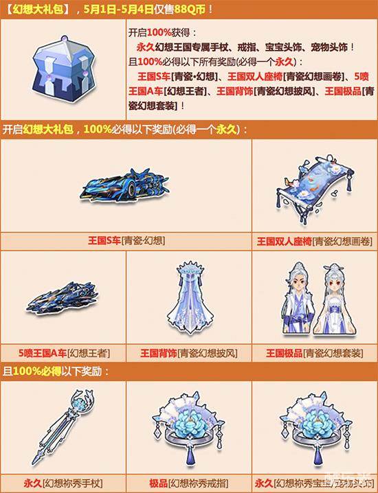 5月1日-4日,购买王国大礼包,100%获得王国戒指、永久王国手杖、宝宝头饰、宠物头饰!每个礼包随机一个以下永久极品奖励:永久S车【祥瑞·流火】/【玉影·疾风】/【青瓷·幻想】、永久双人座椅【青瓷幻想画卷】、【祥瑞流火圣剑】、【玉影疾风玉簪】。小伙伴们只需购买对应王国礼包,即可享受以上超值优惠!