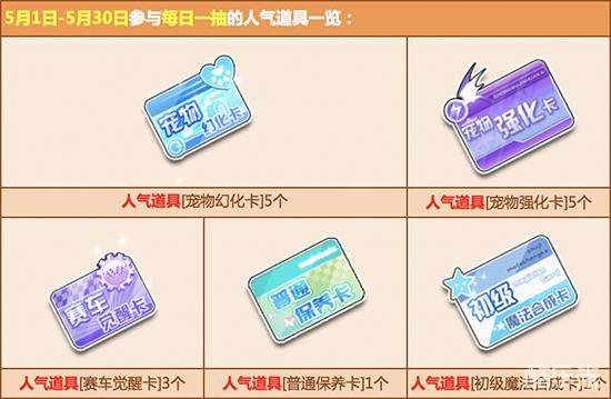 5月1日-30日,每日一抽奖励全面升级,永久A车、永久极品套装、极品双人座椅等你来抢,千万不要错过哦!