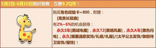 5月2日-6月10日,在飞车商城购买【角色经验卡+900】,赠送【高贵长颈鹿】,有机会获得永久S车【黑域电魔】、永久T2【黑暗风暴】、永久A车【黑色闪电】、永久【曜墨逸歌发饰/礼裙/礼服】/【太平公主发饰/御前侍卫发饰/服饰】或其他奖励之一!其中核心极品期限型概率范围为:4%-6%,核心奖励永久型概率范围为:2%-4%,非核心奖励概率范围为:90%-94%。