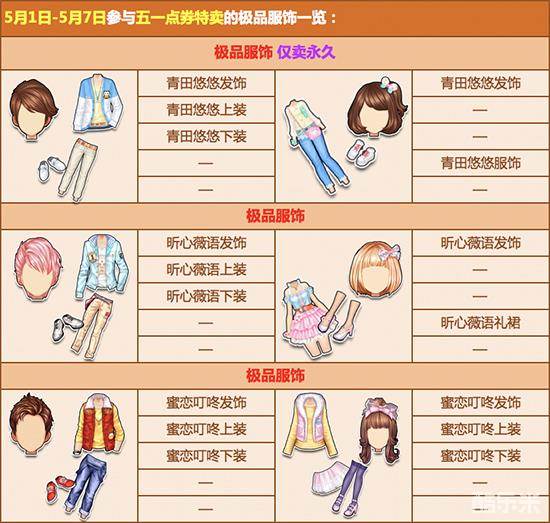 5月1日-7日期间,极品点券套装【天心韩情套装】、【清冽伊人套装】、【佐罗世袭套装】、【萌牛萝莉套装/萌牛正太套装】等限时出售,手快有,手慢无哦!