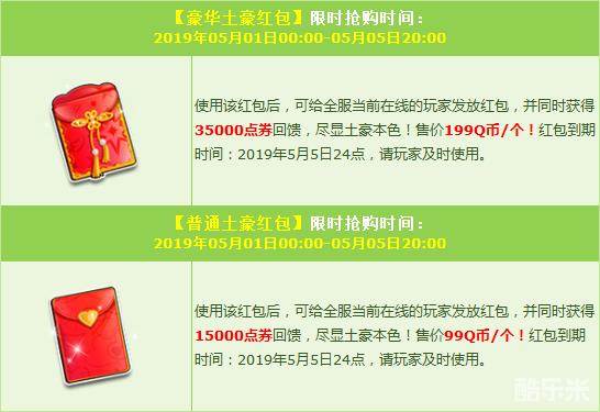 2019年5月1日0点-5月5日20点期间,【豪华土豪红包】和【普通土豪红包】限时销售,给全服玩家发放红包,尽显土豪本色,同时还有万元点券的超值回馈,化身土豪超简单!
