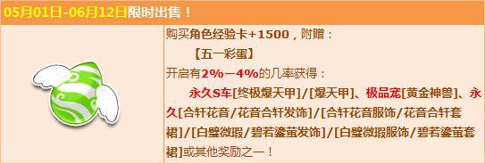 5月1日-6月12日期间,购【角色经验卡+1500】,赠送【五一彩蛋】,有机会得永久S车【终极爆天甲】/【爆天甲】、极品宠【黄金神兽】、极品【合轩花音/花音合轩发饰】/【合轩花音服饰/花音合轩套裙】/【白璧微瑕/碧若鎏萤发饰】/【白璧微瑕服饰/碧若鎏萤套裙】或其他奖励之一!其中核心奖励期限型概率为4%-6%,核心奖励永久型概率为2%-4%,非核心奖励概率为90%-94%。