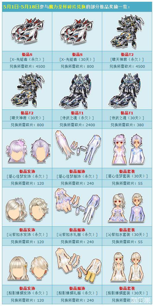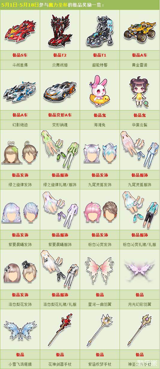 5月1日-5月18日期间,魔力圣杯奇幻更新,极品永久S车斗战胜佛、X-先驱者等限时抢,还有永久A车、人气套装、极品宠等超多奖励,千万不要错过哦!