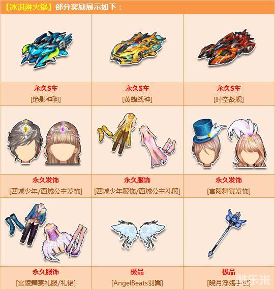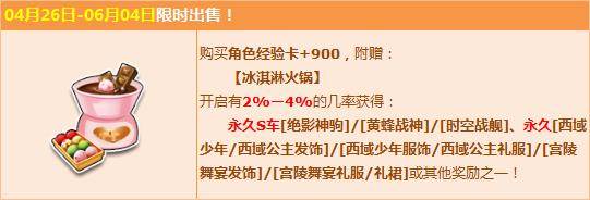4月26日-6月4日期间,购【角色经验卡+300】,赠送【冰淇淋火锅】,有机会得永久S车【绝影神驹】/【黄蜂战神】/【时空战舰】、永久【西域少年/西域公主发饰】/【西域少年服饰/西域公主礼服】/【宫陵舞宴发饰】/【宫陵舞宴礼服/礼裙】或其他奖励之一!其中核心奖励期限型概率为4%-6%,核心奖励永久型概率为2%-4%,非核心奖励概率为90%-94%。