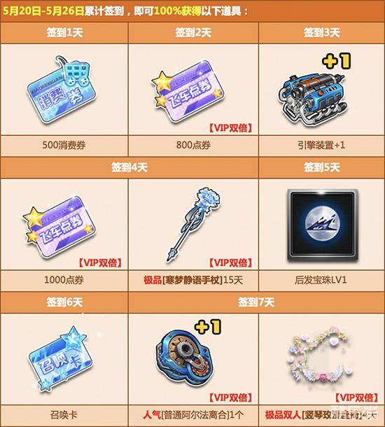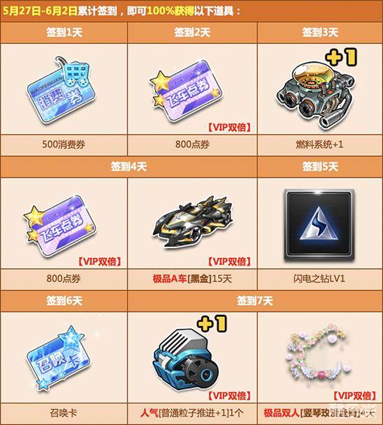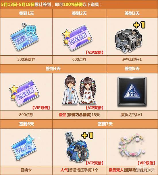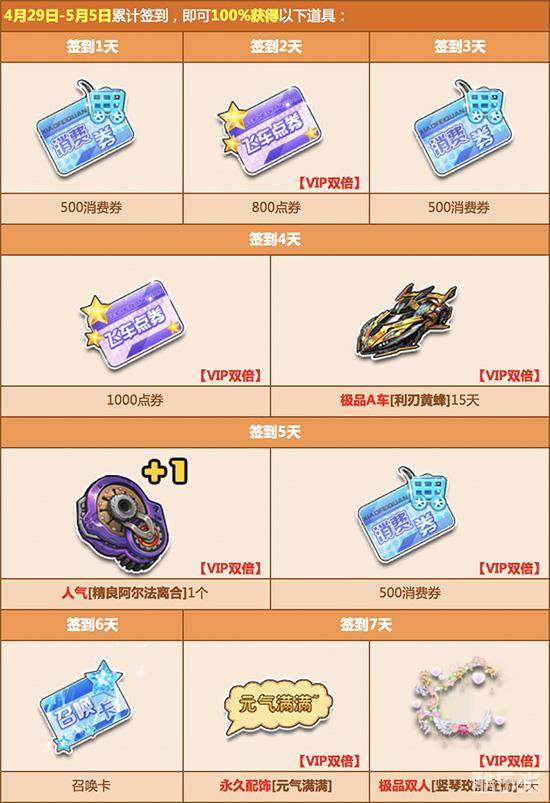 4月29日起,每天登录游戏完成签到任务,即可获得丰厚的点券奖励、人气道具、极品A车和双人座椅福利!