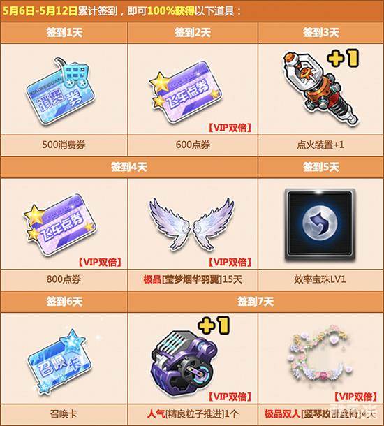 本期签到还有极品双人座椅【挚恋金丝椅】、极品A车【雾海之鹰】等你来拿,VIP最高可领14400点券!累计签到3周,还可以抽取永久A车【怒焰飞跃】、永久极品双人座椅【波斯王椅】、永久极品套装【薄荷方糖套装】等惊喜奖励!