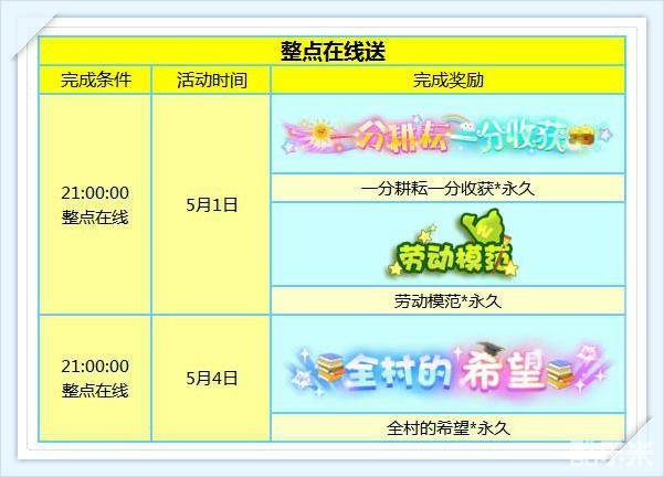 5.1和5.4晚21点整点在线,两个永久称号带回家~一下子可以收获两个永久称号,有收集癖的你是不是超满足呢!另外还有劳动模范精美饰品赠送哦~这么强的回馈,千万不要错过哦~