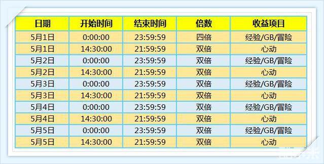 5.1-5.5,全天开启多倍经验,GB,冒险收益,5.1当天更是4倍哦!快速升级不是梦~另外,重要的事情说三遍,心动双倍,心动双倍,心动双倍,小长假期间,每天指定时间内都会开启哦!惊不惊喜,意不意外!