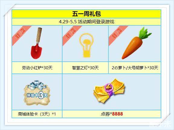 4.29-5.5,登录游戏即送五一周礼包一份,精美饰品+8888点券,统统带回家!更有商城体验卡免费领取哦~