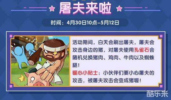 活动期间,玩家在生存模式下白天会遇到屠夫,屠夫会攻击周围的猪,给屠夫孔雀石可以随机兑换猪肉、鸡肉、牛肉以及蜘蛛腿。要小心攻击哦,被屠夫攻击会变成猪。