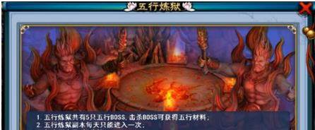 1. 五行炼狱共有5只五行Boss,分别为金、木、水、火、土属性。