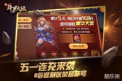 欢庆5·1,《新斗罗大陆》最豪连充福利活动再次开启,活动7天内每天累计充值168元,每天均可获得6倍超高返利,S魂师、S暗器、觉醒积分、S仙品、S武魂真身等你拿。
