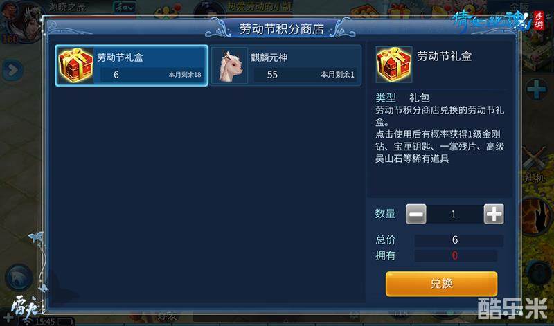 此外劳动节活动期间,玩家参与日常玩法可获得劳动奖章奖励,使用后有几率获得金刚钻、宝匣钥匙等珍贵道具。同时玩家凭借节日积分可在假日积分商店换取劳动节礼盒、麒麟灵兽元神!劳动节礼盒内含金刚钻、宝匣钥匙、一掌残片等好礼!