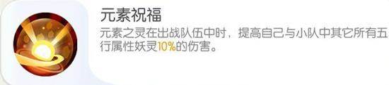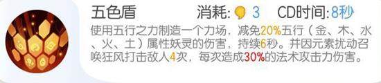 | 元素之灵虽然定位法术坦克,但实际上,这位大哥级妖灵法术输出也强得很!被动辅助可以在场下提高其他五行妖灵的输出,五色盾又是性价比最高的技能,有极高的输出并且减伤!就是合成的成本略高! |